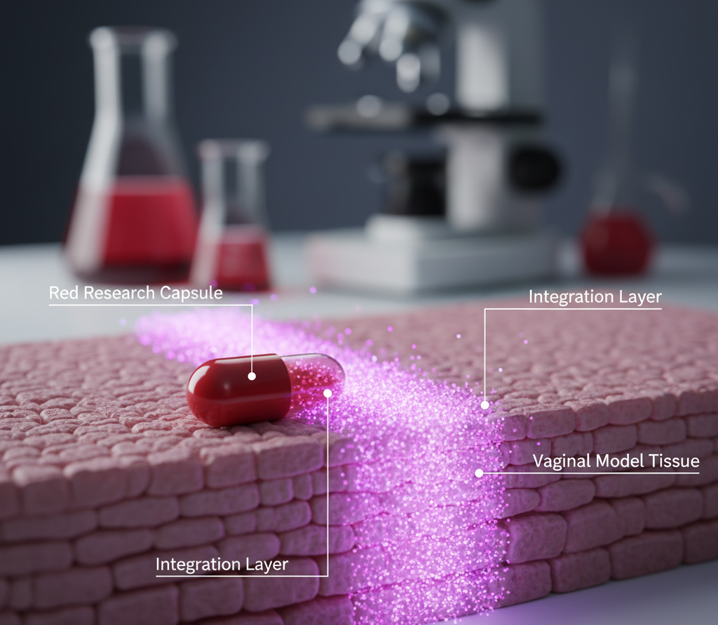 توضح الصورة نموذجًا علميًا تخييليًا لآلية عمل الكبسولة الحمراء المستخدمة في إعادة ترميم غشاء البكارة بشكل دائم.