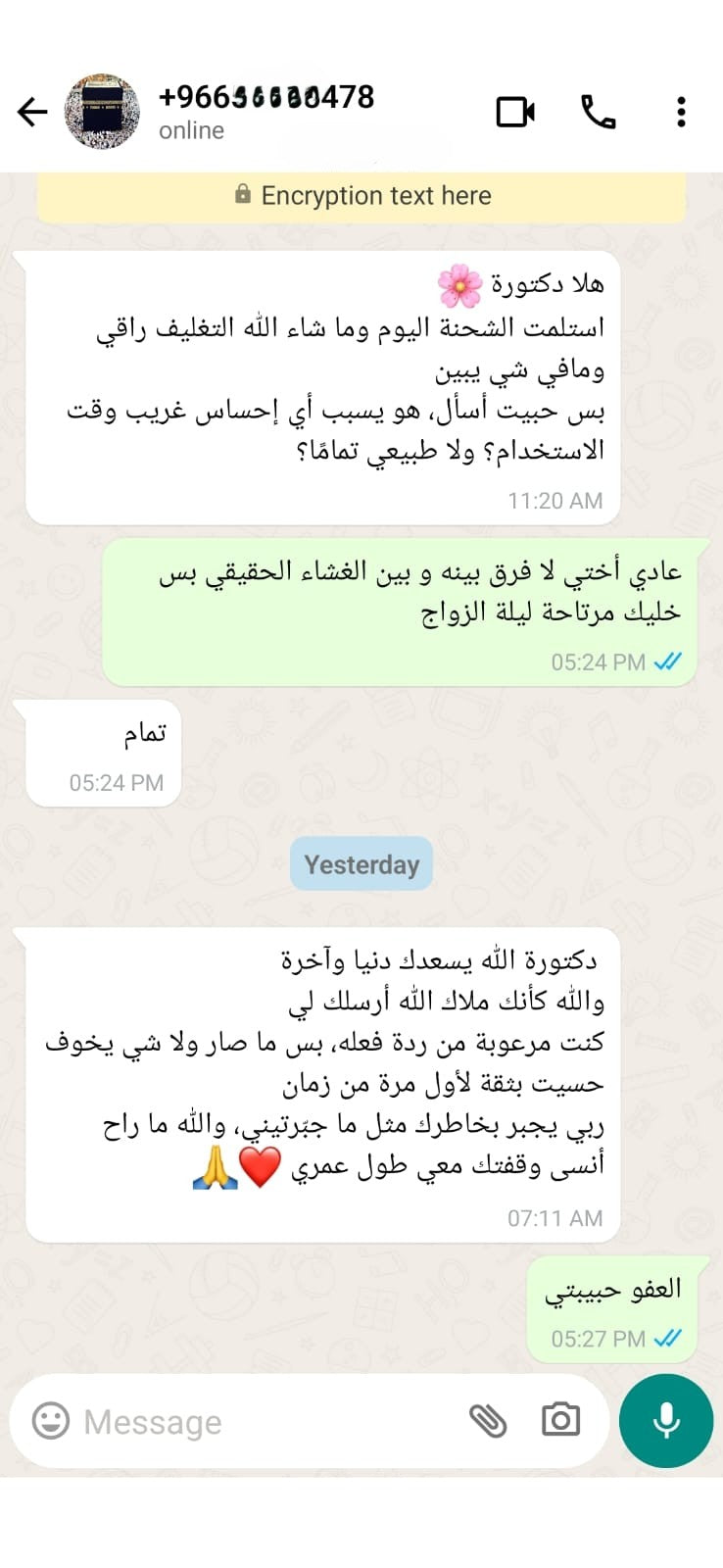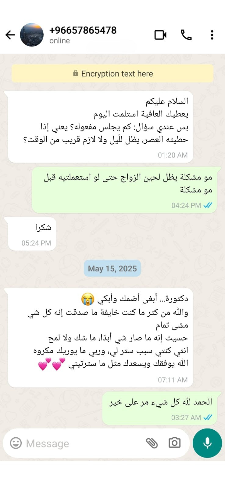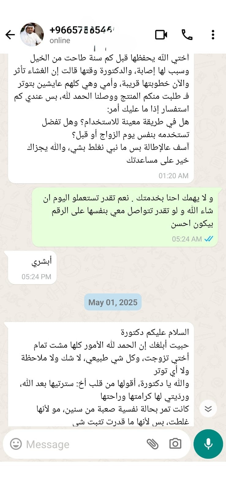 عميلتنا كانت تشعر بالخوف والارتباك قبل ليلة زفافها، لكنها بعد استلام المنتج وتجربته، عبّرت عن سعادتها الكبيرة بالنتيجة الطبيعية والراحة النفسية التي منحتها إياها التجربة. ثقتها بنفسها عادت كما لم تشعر بها منذ زمن، وعبّرت عن امتنانها بعبارات مؤثرة تعكس مدى رضاها عن جودة المنتج وخدمته.