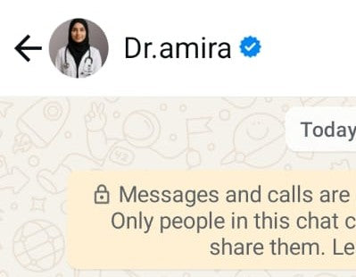 تأكدي انه عند النقر على زر التواصل ستجدين اسم الطبيبة و ليس الرقم مع علامة زرقاء تتبت توتيق الواتساب أنه فعلا موتق بوتائق العيادة للطبيبة .