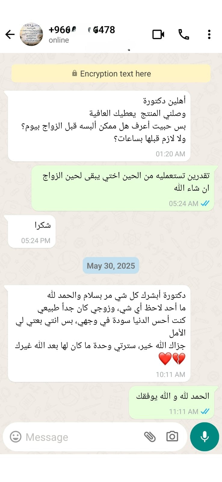 عميلتنا كانت تشعر بالخوف والارتباك قبل ليلة زفافها، لكنها بعد استلام المنتج وتجربته، عبّرت عن سعادتها الكبيرة بالنتيجة الطبيعية والراحة النفسية التي منحتها إياها التجربة. ثقتها بنفسها عادت كما لم تشعر بها منذ زمن، وعبّرت عن امتنانها بعبارات مؤثرة تعكس مدى رضاها عن جودة المنتج وخدمته.